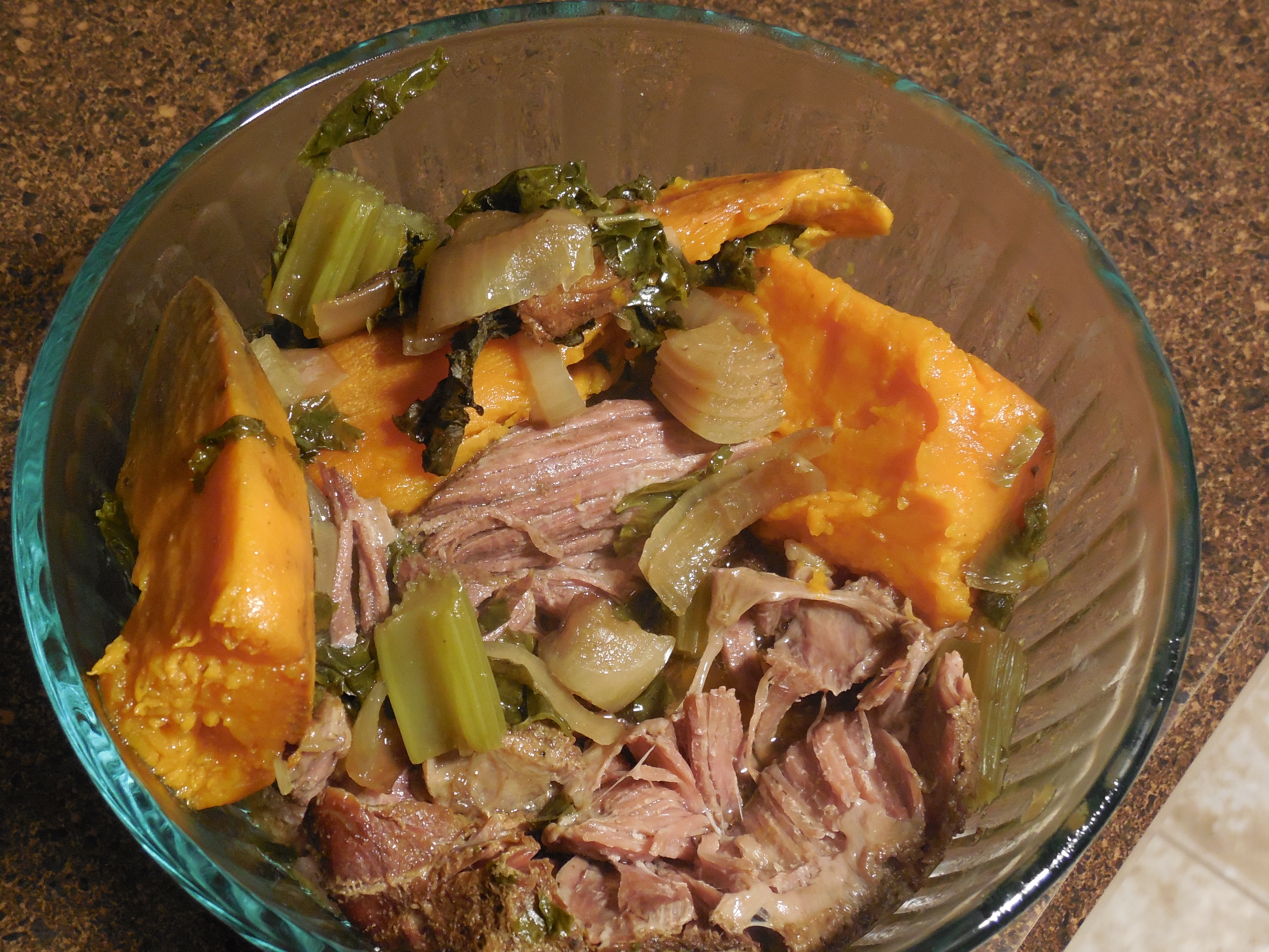 From there I placed the roast in my crockpot on low and covered it with a couple cups of bone broth, yams/sweet potatoes, carrots, celery, kale & onions. I cooked it on low for 6 hours before serving. As I had already seasoned the roast and bone broth with salt, pepper and garlic I didn’t add any additional seasonings. However, I sometimes throw in a tablespoon of Italian seasoning or rosemary if I need to.