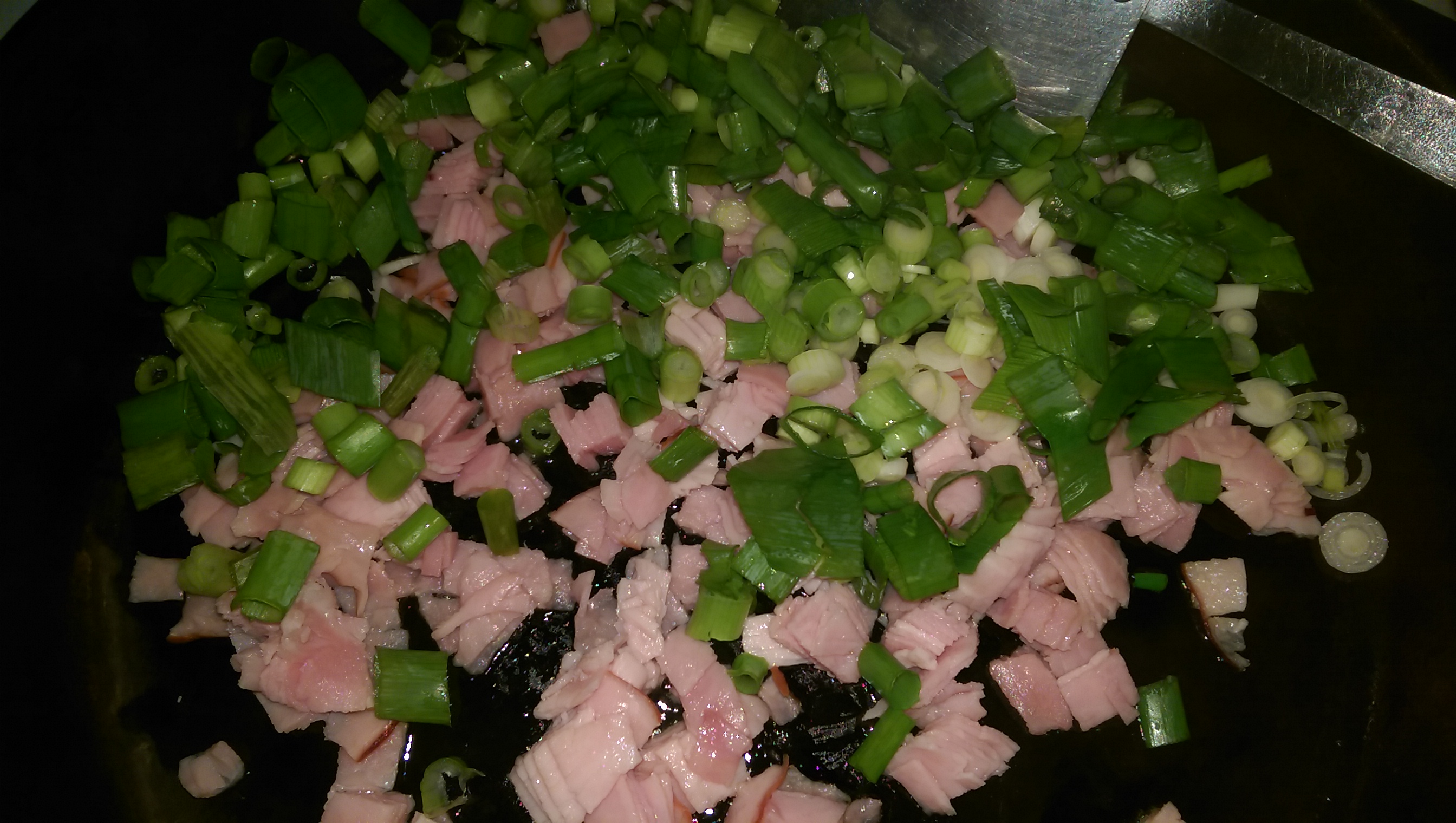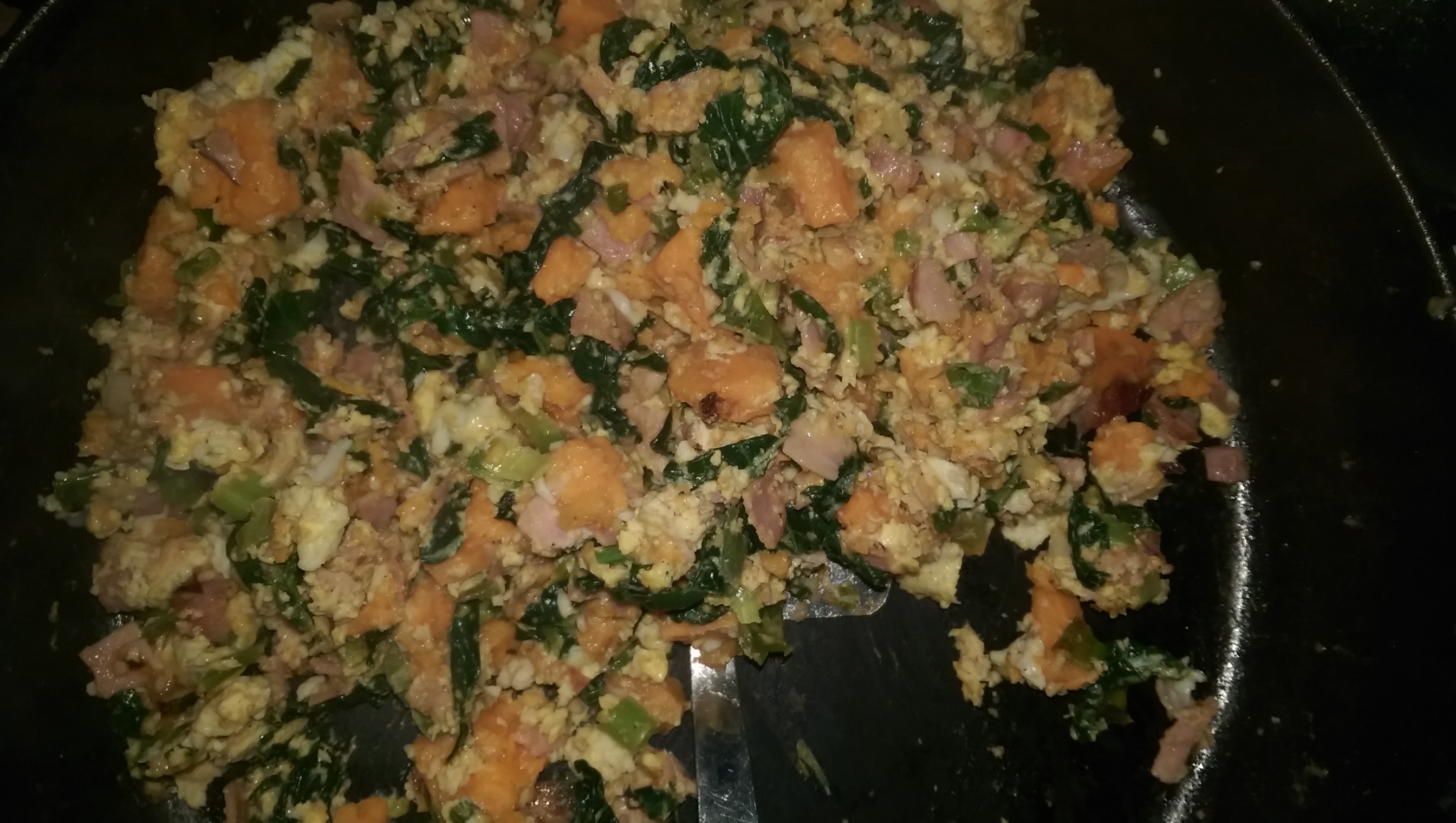 Dice meat and sauté in fat until nearly cooked. Add chopped vegetables and cook. Scramble the eggs with the spices and add to the cooked meat and veggies. Cook until eggs are blended with the meat and vegetables and firm.