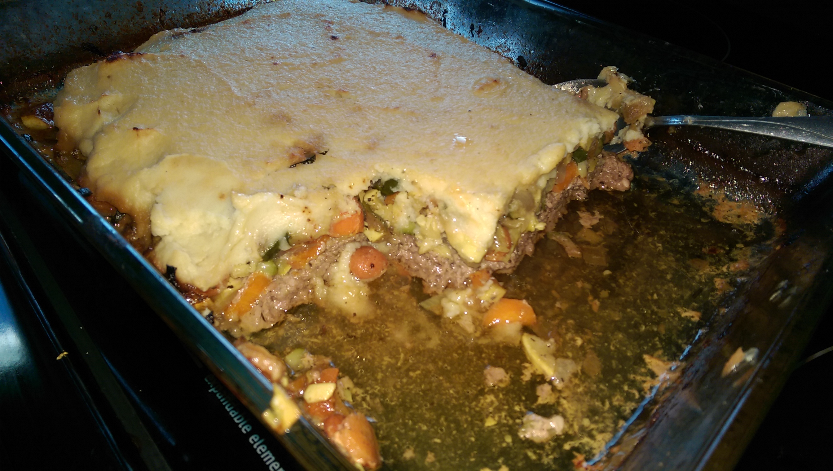 Shepard’s Pie– Ingredients: ground beef, zucchini, yellow squash, onion carrots, cauliflower, marjoram, thyme, salt, pepper, granulated garlic, Worcestershire sauce, ghee (or other cooking fat)